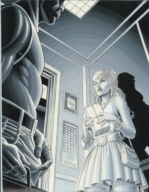 Alison returns to a modern office tower in a big city after running out to buy office supplies for her boss. It is becoming dusk, perhaps seven or eight o'clock in the evening, and she has been told that she will have to work late tonight to help prepare some big presentation for tomorrow. Her high-heeled footsteps echo in the half-darkened lobby as she crosses it to get into an empty elevator.