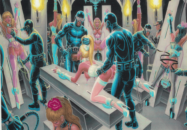 Alison squirms there sitting on the edge of the bed, gazing up at her boss, her manacled hands resting in her lap, her anxious thighs rubbing together. She's still pretty stoned from the stuff she snorted an hour or so ago, although Slate's diatribe has had a somewhat sobering effect. Time seems to have become stretched out somehow… She feels unreal and detached, yet still very much present in the physical sense. Her body thrums with excitement and fear. She wants to be good for him… she'll try to be good for him, in spite of her resentment over the way she has been suckered by her slutty roommate. On the TV screen in the other room, she sees a closeup of Fiona tonguing her to orgasm on the day they shaved. Fiona knew all along, of course. The dark haired girl now returns to her bedside with a wooden box bound in metal, containing an assortment of collars and cuffs. They are of steel covered with black leather, slightly padded on the inside with some quilted material, and possessed of their own locking mechanisms. Around the outside of these objects, several rings provide ample opportunities to attach fastenings. "You will wear this collar and these cuffs as long as you are with me…" sez Slate, fitting the black choker around her neck and clicking it closed with a audible and final-sounding metallic snap. He changes the handcuffs for matching wrist bands, Fiona helping him to hold the blonde's arms as he makes the switch. Alison struggles slightly, ineffectually. The collar and cuffs fit her tightly but not painfully so.