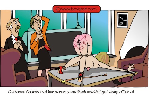 Catherine looks up from where she lays hogtied on the floor and says with a strained smile