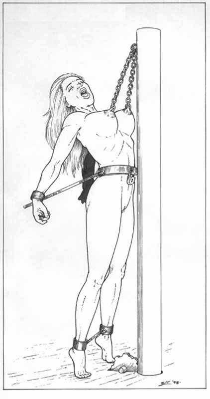 Her wrists were cuffed to ropes which were attached to a belt. The ropes
