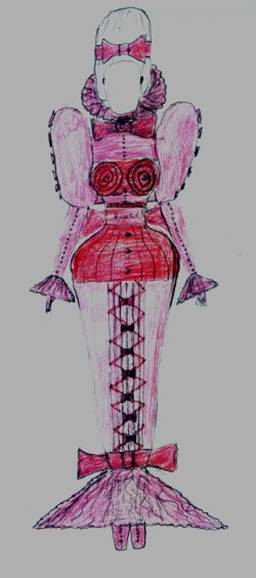 Pinky looked in the mirror and saw her reflection, she was totally appalled. She looked completely tacky. The two flounces along with bows made her look like a heavily wrapped pink toffee. The whole pink outfit with the flounces and the bows made her look like Barbara Cartland on acid. What would people think when they saw her.