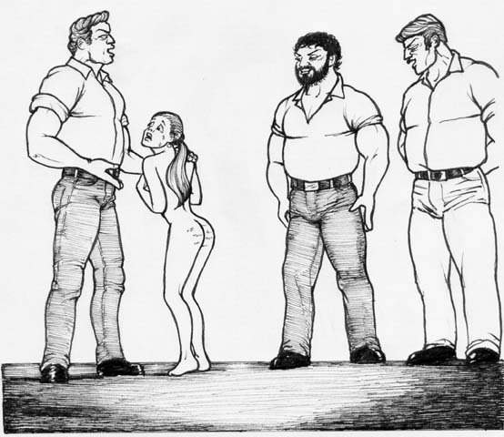 To Obey by Fire-Bird Chapter 36 "Builders Present" The office door opened. Mr Boggis walked in, put his hat on the hat stand followed by his coat. He checked his tie in the mirror and carefully flicked some lint from his shoulders. He took the pitcher of water and poured himself a drink. He sat down at his desk and carefully placed his glass down amongst the paper work. A few minutes later he heard a noise outside the office. Must be Jenny he thought. "Jenny?!" called the headmaster. The door opened and the School slave walked in. She had on a black T-shirt which showed off her curves in all the right places. Her jeans were a little big for her but it made them easier to take off quickly. She stood just inside the doorway awaiting the headmaster's orders. "Appointments today?" asked the headmaster. "None today Mr Boggis. But the head porter has gone to pick up the two Henderson girls a few minutes back." "Good. He'll be back in a few hours. I want you to go over to the building site and find the head foreman. Tell him I sent you and remember, you are to do exactly what he says. Got it?" "Yes Sir. Should I change Sir?" "No. Off you go." The headmaster watched as Jenny closed the door to his office. He counted a few seconds then looked out the window. Sure enough Jenny walked out the door and around the corner making a beeline towards the building site. He picked up a pen and crossed off an entry on his to do list. He then took some more papers and carried on cross-referencing. Jenny felt the morning sun as it warmed up her body. She took her time walking across the lawn as it was soaked through with the rain over the last couple of days. She could hear sounds of the digging machines at the site as they rumbled away. She came across a man who was looking through a telescope at the building. "Excuse me Sir, where is the Head foreman?" The man took a quick glance at her and then returned back to his scope. "That's me doll. Who are you?" "Jenny Sir. Mr Boggis sent me over. He also gave me instructions to do whatever you say." The man looked down at his clipboard and wrote some numbers. He stood up and stretched his back. Only then did he turn to look at Jenny. He started at her shoes and worked his way up her body. "The entertainment huh? ... Mr Boggis has good taste. Come with me." Jenny followed the foreman towards a tent. He dropped his clipboard on a table then looked around. He seemed to sight the person he wanted. Putting his fingers to his mouth he made a loud whistle. When the man turned around the head foreman waved his hand for him to come over. "Okay .. Jenny wasn't it? ... My name is Jim. This is Joe and over there is Jack. Do you understand?" Jenny nodded her head. It wasn't uncommon for married men to want to remain anonymous. The man called Joe arrived. "Ya wanted me boss?" Jim winked over to Joe, "Entertainment for us courtesy of Mr Boggis." Joe looked Jenny over. He liked what he saw. Joe had a thick dark beard where Jim was clean shaven. Another man joined the tent. "Ah Jack." Another wink. "This is Jenny. The entertainment." Jenny looked at each of the men. They were big. Their arms are nearly as large as what she was. She reached into her jeans and pulled out a rubber band. Quickly she pulled her hair into a pony tail while Jack returned with a chair. The men were all sitting waiting for her. Jenny looked over to Jim. "Sir?" "Strip darling. And do it nicely." Jack sniggered. Jenny turned her back to the men and started to him a tune. She ran her hands along her body across her breasts all the way down to her thighs. Already her excitement was building. If she didn't hurry she'll cum before she had a chance to take her jeans off. Jenny pulled off her shoes and socks. Her feet squelched into the mud but she ignored it. Then came off her black T-shirt which she flung over to Joe. Jack rubbed his mustache. Jenny saw the bulge in his pants. She walked over to him and sat on his knees and allowed him to un-clip her bra. Then she stood up and kissed him on fully on the lips before walking back into the center of the tent. She pulled off her jeans leaving only her panties. "Who wants the honor?" she asked. Jim looked over to the other guys, "Jack does." Jack smiled. Jenny walked over seductively and presented herself to Jack. He looped his fingers inside her panties and pulled them down revealing her pussy. Jack then leaned forward and ran his tongue up her tummy. Jenny cooed and pushed his face into her breasts. A few minutes later Jim stood up. "Okay guys, now for some real fun." He put the chair in the middle of the tent and then undid his belt. "Spanking time Jenny. Do the position." Jenny immediately stood up and leaned against the chair. She spread her legs a little to keep her balance. Jim raised his hand and swung his belt smacking her across the butt. "Aaah!" cried Jenny. Again the head foreman swung. Then the other guys took their belts too and whipped Jenny. A few minutes later Jenny's ass and legs were a nice tone of red. Jim dropped his belt onto the table. "What now guys?" "I want a blowjob." said Joe. "Me too." replied Jack. "Well Jenny, you've got some work to do. Get to it." ___________________ John knocked on the door. A few minutes later a woman answered it. "Yes?" she asked. "Hi. I'm after a Mr Henderson. Does he live here?" "What is it concerning?" "Sorry Miss. The delivery is for a Mr Henderson." said John. The girls rolled her eyes and slammed the door. John could hear her as she stomped back up the stairs. "Daddy, some fuckwit's at the door for you." A few seconds later a man opened the door in his dressing gown. "Morning. I am sorry for my daughters behavior. I am Don Henderson." "Good morning Mr Henderson. My name is John. I work for Hackmoore's school. I'm here to take a delivery." Don smiled. "John, you may not believe this but you've just made my day." as he stood to one side and beckoned the head porter in. ___________________ Jenny was getting a head